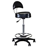 Black ergonomic stool is ideal for massage therapists, tattoo artists, dentists, manicurists, and spa estheticians. This stylish and adjustable stool is designed for comfort with ergonomic design bike seat, back support and adjustable foot rest. It features soft, yet strong black vinyl upholstery with thick padding, a chrome foot ring, five star base with extra smooth wheels for stability, and a hydraulic lift to adjust height.